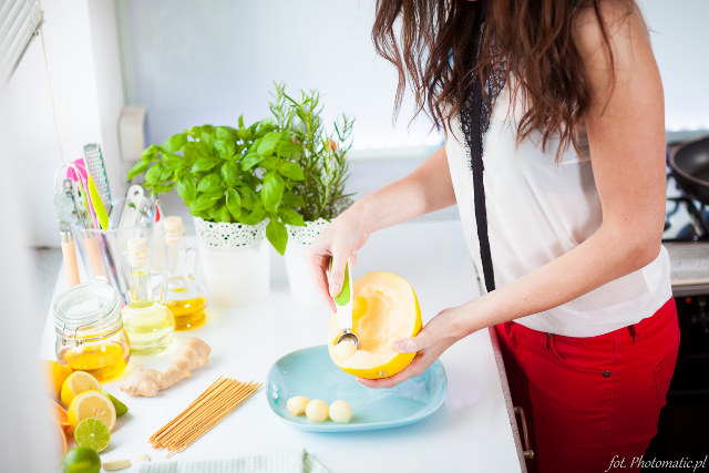 2. Z melona usuwamy gniazdo nasienne i łyżeczką do wydrążania owoców tworzymy zgrabne kule. Jeśli nie macie łyżeczki do owoców pokrójcie melona w plastry (około 2 cm grubości), a następnie w kostkę.