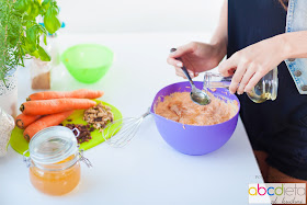 3. Białka oddzielamy od żółtek, a następnie białka ubijamy ze szczyptą soli na sztywną pianę. Wlewamy żółtka i miksujemy. Do gotowej masy dodajemy startą marchew i delikatnie mieszamy. Stopniowo dolewamy oliwę i miód ciągle mieszając.