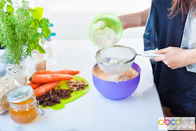 4. Następnie przez sitko przesiewamy "mąkę", proszek do pieczenia i przyprawy i także delikatnie mieszamy lub miksujemy na wolnych obrotach.