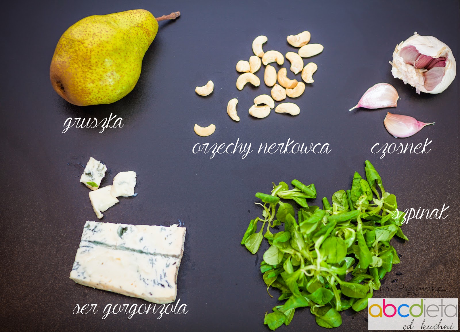 2. Gruszkę i roszponkę dokładnie myjemy. Gruszkę kroimy w cienkie plastry, ser gorgozola w kostkę.