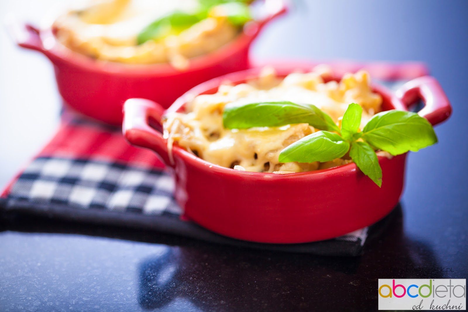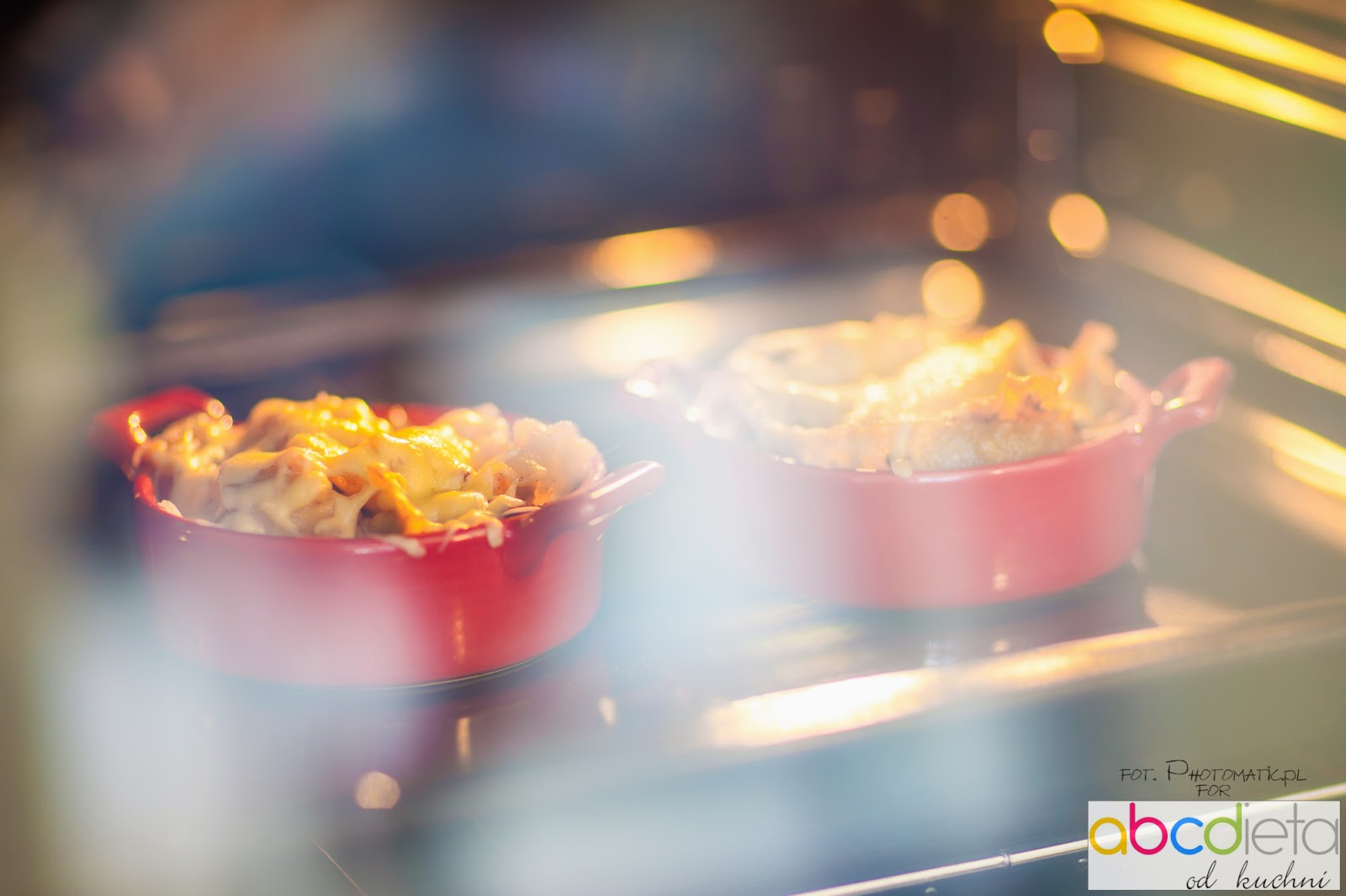 4. Makaron przekładamy do kokilek. Posypujemy tartym Parmezanem i wstawiamy do nagrzanego piekarnika do 200 stopni C. Pieczemy do roztopienia sera.