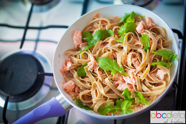 Do przygotowania makaronu z łososiem i rukolą potrzebujemy:
