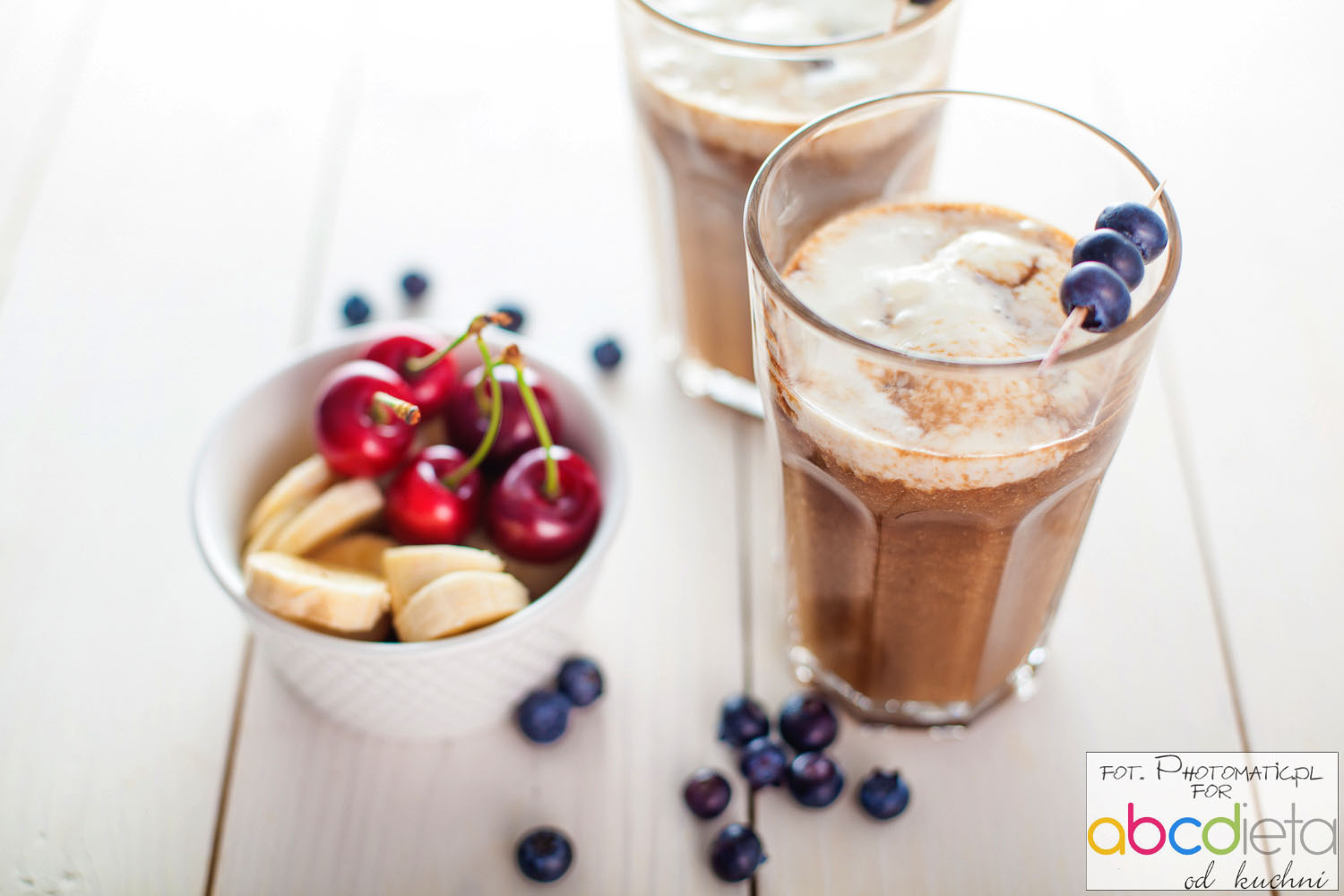 4. Kawę przelewamy do szklanek. Na wierzch wykładamy po łyżce gęstego mleka z puszki. Dekorujemy owocami.