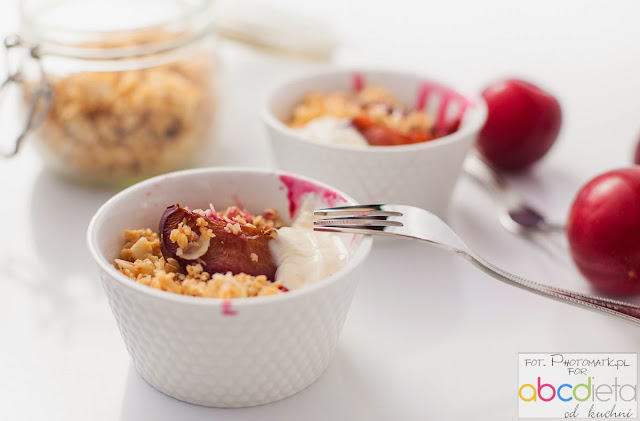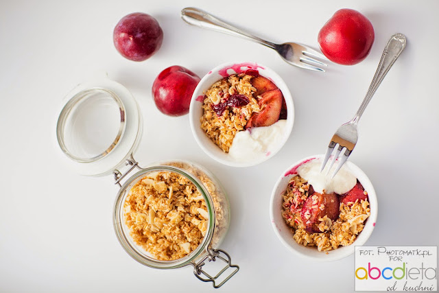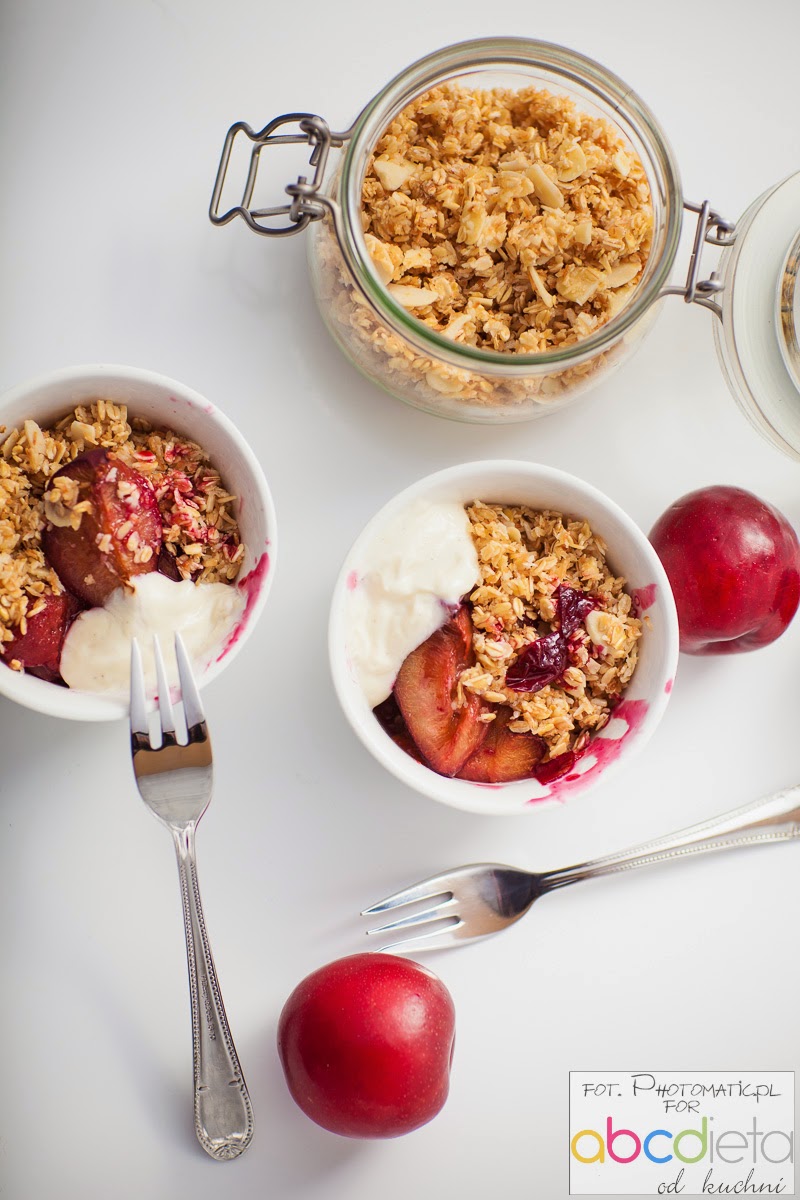 Jedno z moich ulubionych śniadań. Zawsze gdy "chodzi za mną" coś słodkiego, przygotowuję sobie ten deser. Świetnie sprawdza się jako pierwszy posiłek. Do naszej kruszonki/granolki ;) możemy dodać miks naszych ulubionych płatków zbożowych (owsiane, orkiszowe, gryczane, jaglane) i orzechów. Mamy ogromne możliwości, dzięki czemu takie śniadanie nigdy nam się nie znudzi. Do jego przygotowania możemy wykorzystać praktycznie każdy owoc. Świetnie sprawdzi się jabłko, mango, brzoskwinia, gruszka, banan czy nawet maliny. U mnie śliwka, a to dlatego, że sezon na nią w pełni. Oczywiście nie byłabym sobą, jakbym nie wspomniała o jej właściwościach.